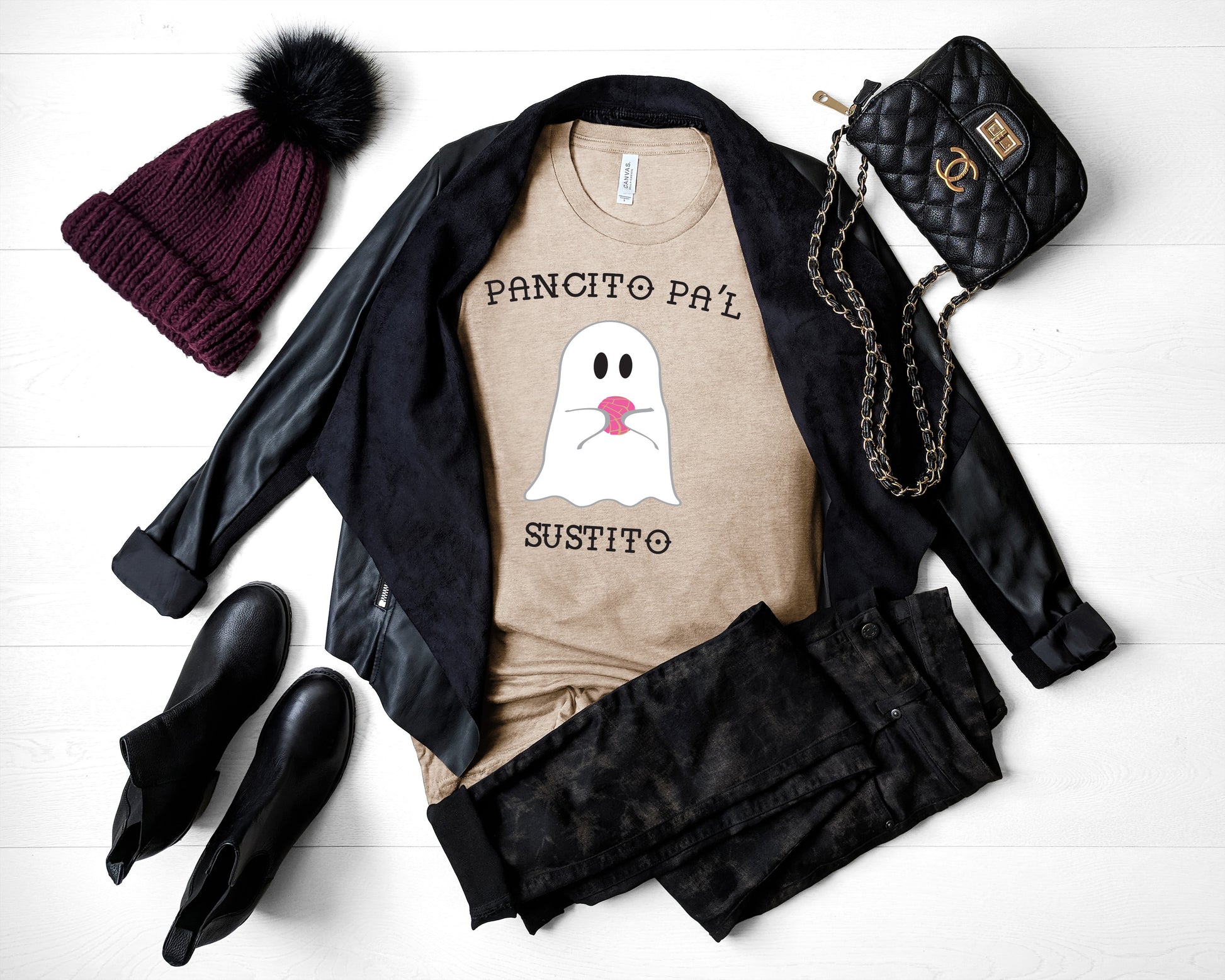 Front and center, the phrase "Pancito pa'l sustito" brings an instant smile to your face, offering a touch of light-heartedness to your ensemble. Complementing the phrase is a charming ghost graphic, adding an element of sweetness and whimsy to the overall look.